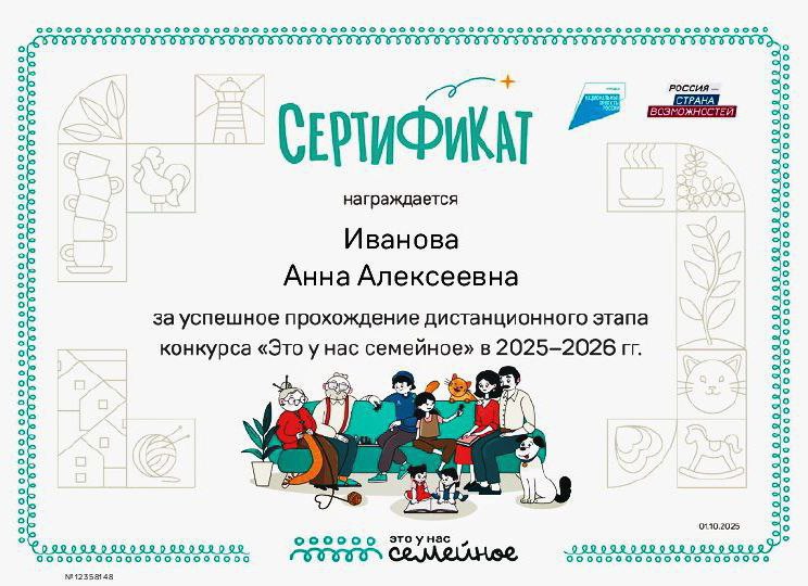 В период с мая 2025 года по август 2026 года проходит второй сезон Всероссийского конкурса «Это у нас семейное». В конкурсе, который с этого года стал частью национального проекта «Семья», несколько этапов: регистрация, дистанционный этап, окружные полуфиналы и финал. Дистанционный этап проходит онлайн. Команды зарабатывают баллы, выполняя разные задания. Основное условие – делать это нужно всей семьей. По итогам этапа сформируют рейтинг и определят семьи, прошедшие в полуфинал.