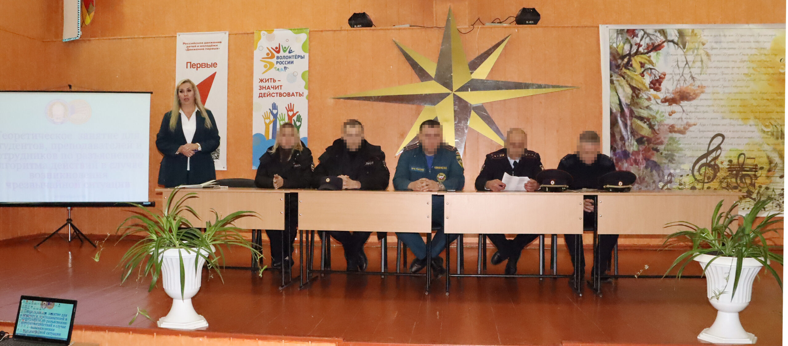 Коллектив Ровеньковского колледжа ЛГПУ благодарит представителей МВД и МЧС за помощь в проведении теоретического и практического занятий для студентов, преподавателей и сотрудников по разъяснению алгоритма действий в случае возникновения чрезвычайных ситуаций.