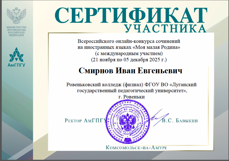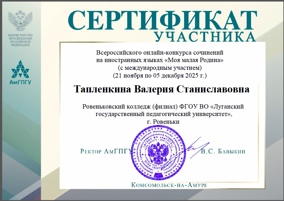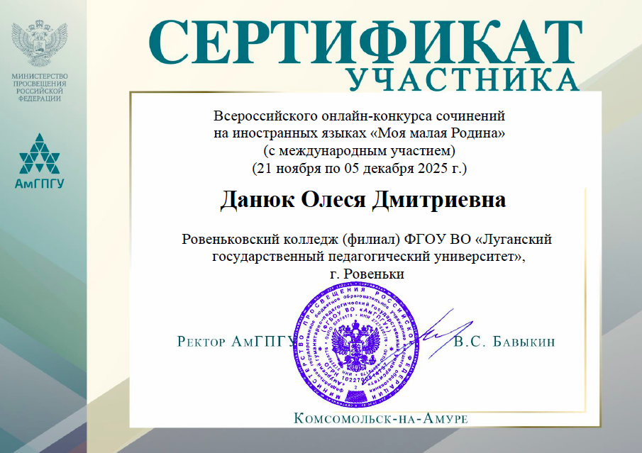 Ровеньковский колледж ЛГПУ поздравляет своих студентов с успешным участием и победой во Всероссийском онлайн-конкурсе сочинений «Моя малая Родина». Этот значимый конкурс, который проходил с 21 ноября по 5 декабря под руководством Амурского гуманитарно-педагогического государственного университета, предоставил уникальную возможность молодым талантам поделиться своими мыслями о родном крае.