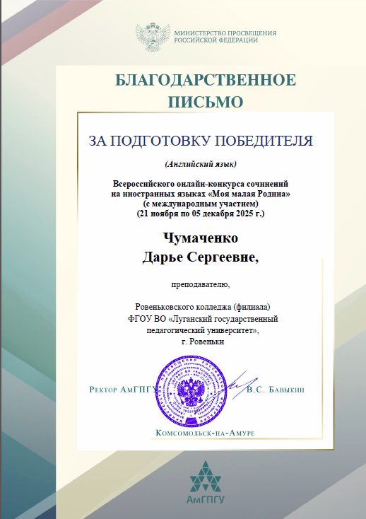 Благодарственным письмом за подготовку победителя награждена Дарья Чумаченко, преподаватель Ровеньковского колледжа ЛГПУ.
