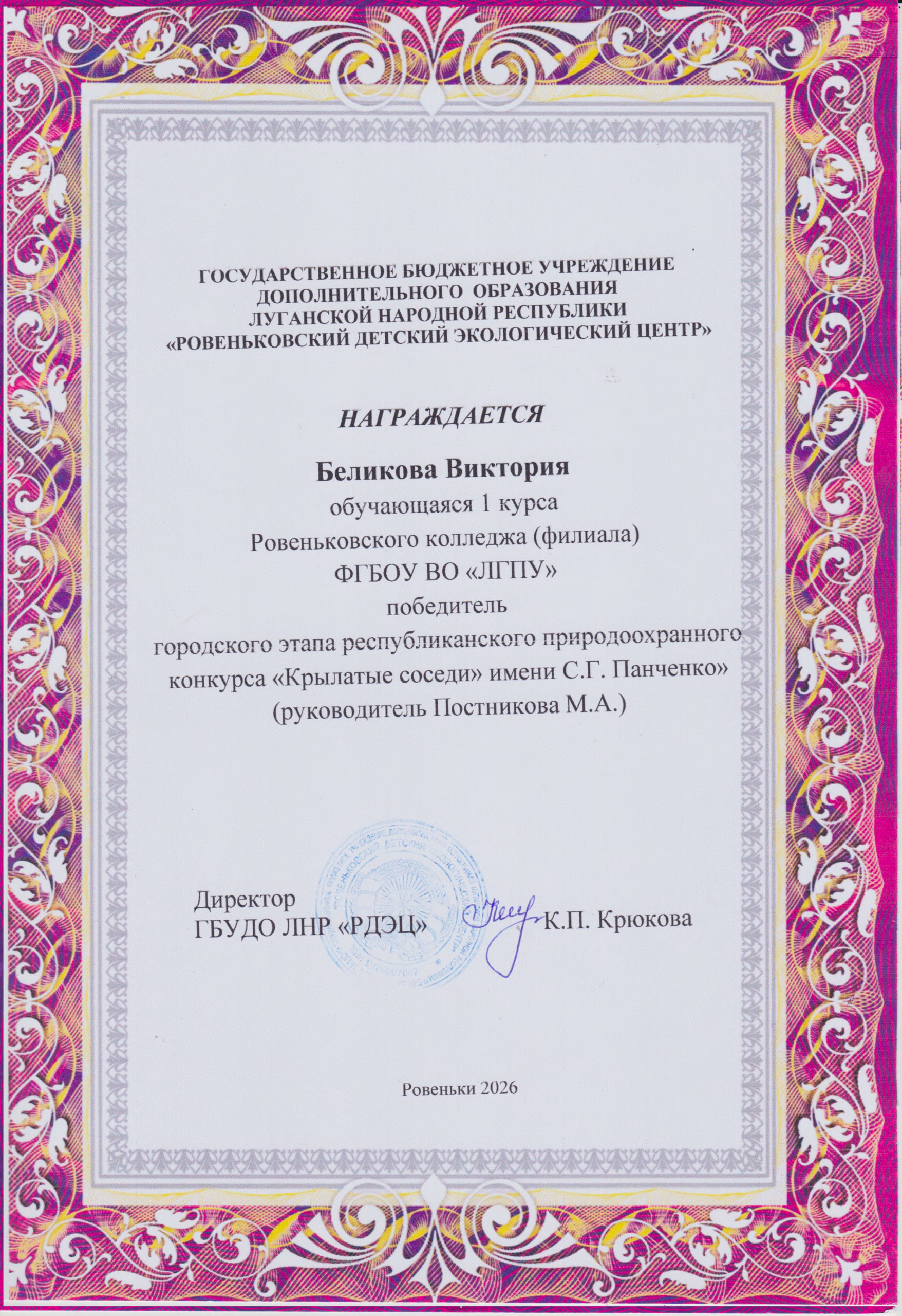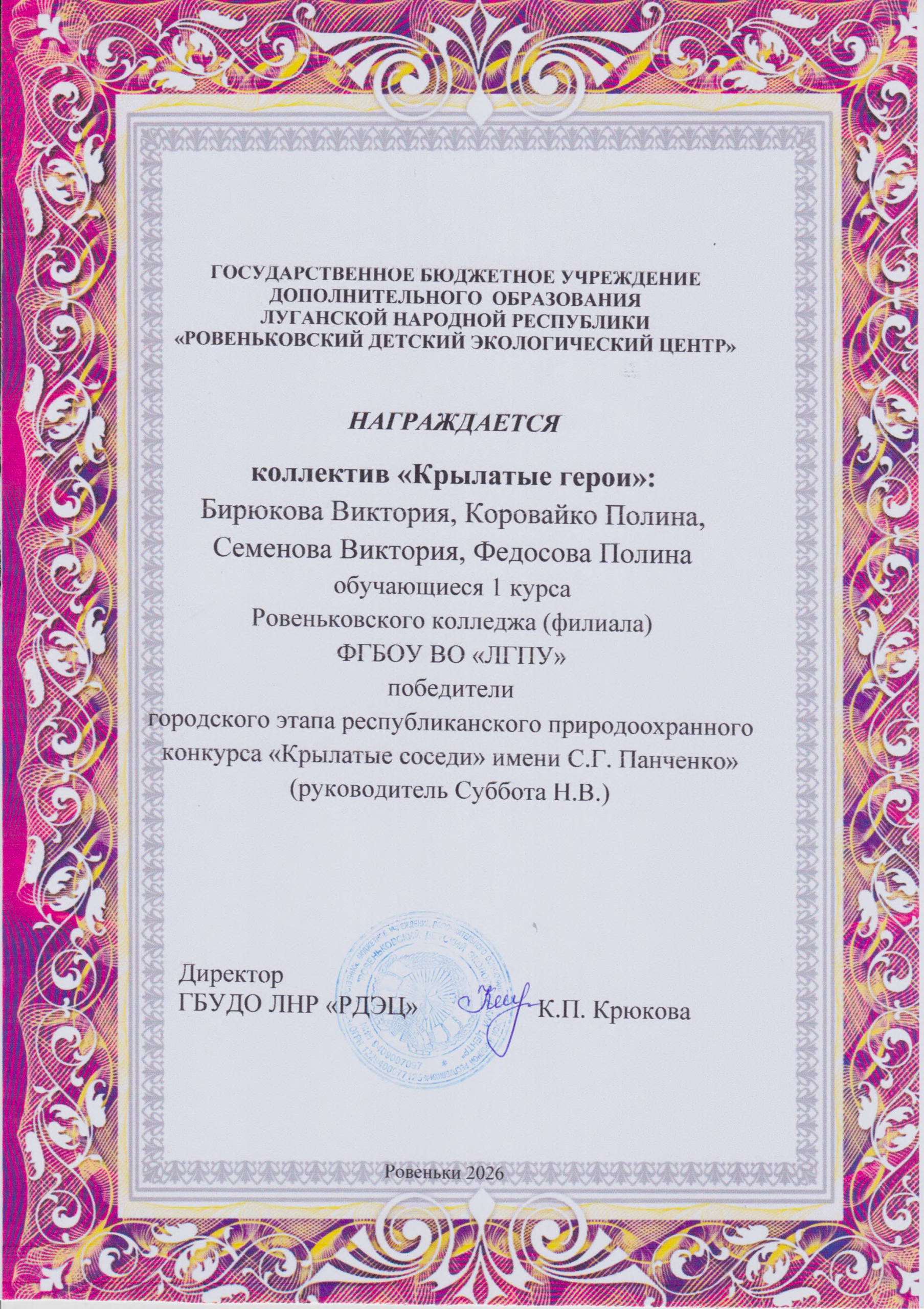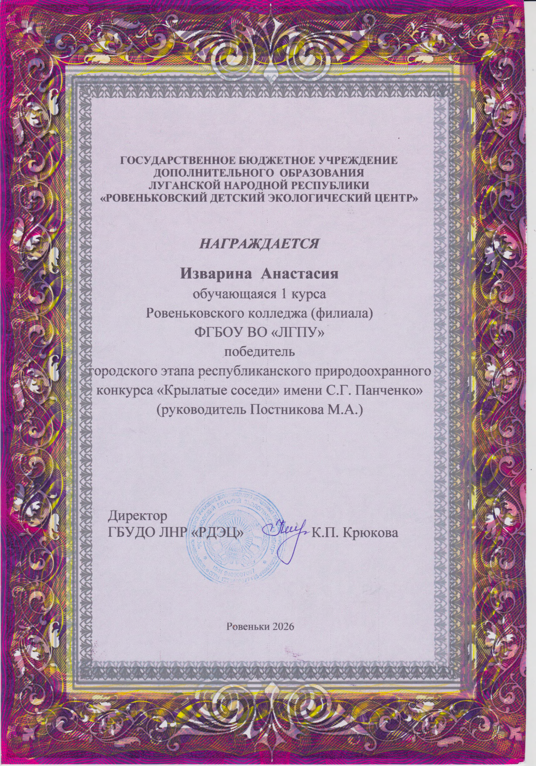 Мы поздравляем победителей и выражаем слова благодарности преподавателям-наставникам Марине Постниковой и Наталье Суббота за подготовку участников к конкурсу! Эта победа – заслуженный результат упорного труда, глубокой заинтересованности студентов в изучении и сохранении природы, а также высокого уровня педагогической поддержки со стороны преподавателей Ровеньковского колледжа ЛГПУ.